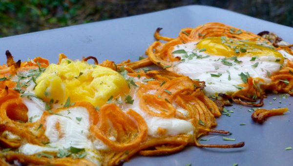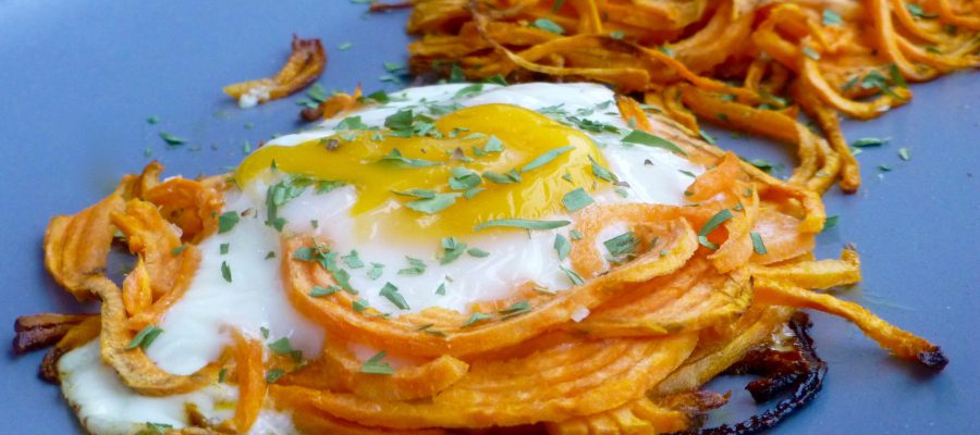 PALEO. En enkel rätt som passar bra till frukost. Rätten lagar till sig själv i ugnen. Använd en spiralizer eller grönsakssvarv för att få till strimlorna fint. Det går också bra att strimla sötpotatisen med en potatisskalare. Glöm inte att salta ordentligt för bästa smak.