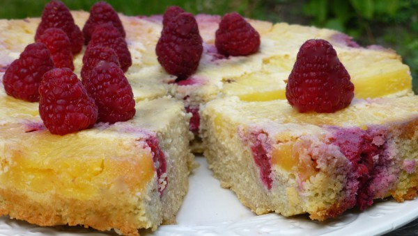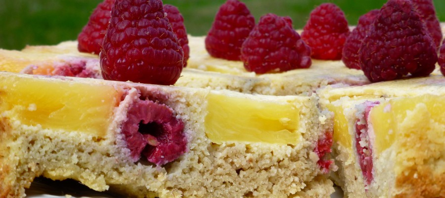 Låt kakan svalna helt innan den tas ur formen och vänds upp och ner så att den serveras med ananas och hallon överst. Det är gott med lite paleoglass eller kokosgrädde med vanilj till.