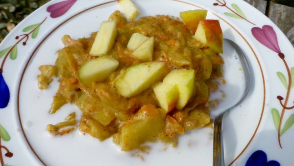 1 msk Kokosolja till stekning 1 Äpple 1 dl Grovt riven morot 2 msk Jordmandelmjöl eller koksomjöl 1 dl Vatten 1 dl Kokosmjölk 1 nypa Salt 1 tsk Kanel Gör så här: