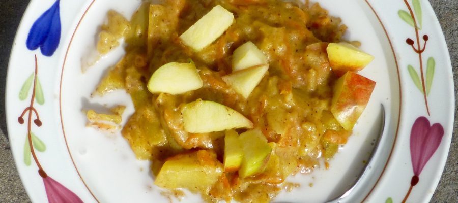 AIP/PALEO. En söt och mättande gröt på äpple och riven morot, kanel och jordmandelmjöl. Har du inget jordmandelmjöl hemma så går det lika bra med kokosmjöl (eller mandelmjöl om du äter paleo).