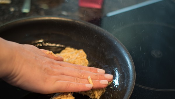 Forma fyra bollar, platta till dem och stek på LÅG värme, ca 8 min per sida i kokosolja. Foto: Denise Vestin.