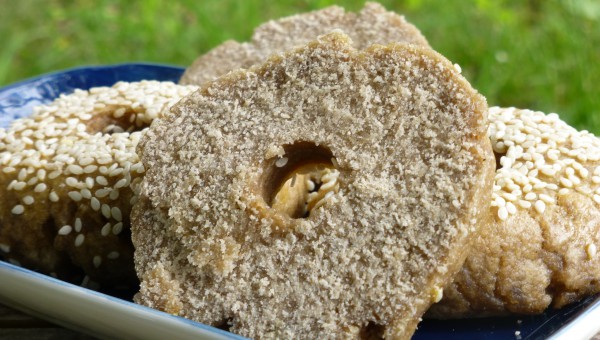 Lägg dem på en plåt med bakplåtspapper och pensla dem med ett uppvispat ägg. Strö över sesamfrön. Grädda i 30 min mitt i ugnen.
