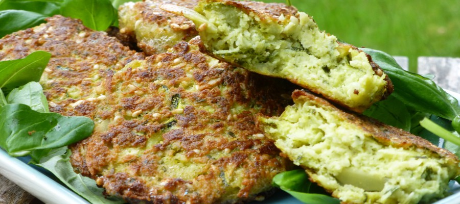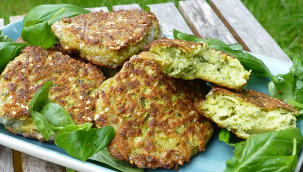 1 st Zucchini 2 st Ägg 2 msk Citronjuice 1 msk Citronzest (rivet skal) 1 msk Potatismjöl, arrowrot eller cassavamjöl 1 dl Mandelmjöl 2 msk Sesamfrön 1 dl Mandelspån/hackad mandel 2 dl Färsk basilika 1 krm Salt 2 msk Kokosolja att steka i 1 klyfta Vitlök, pressad Gör så här:
