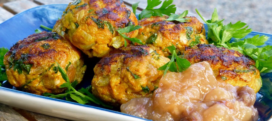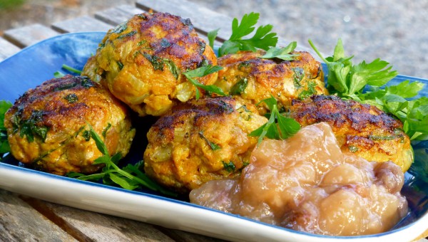 Servera med nomatosås eller äppelchutney och lättkokta grönsaker som t ex blomkål, broccoli eller svarvad zucchini.