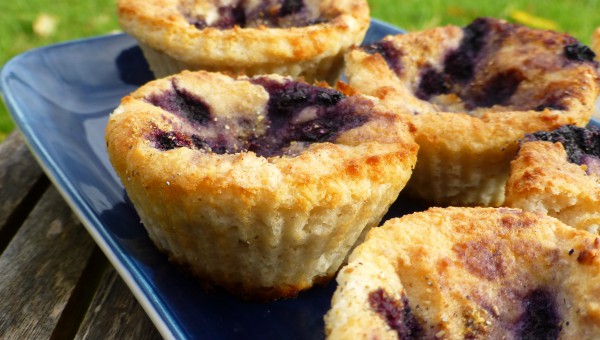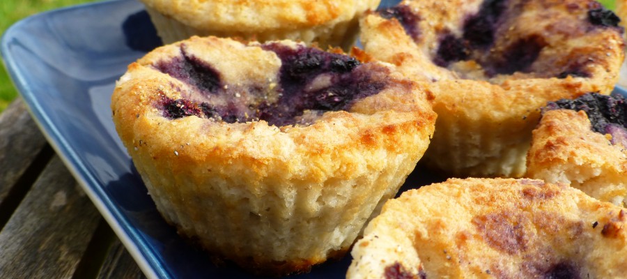 PALEO. Äggfria muffins där jag bytt ut äggen mot fiberhusk och hett vatten. De här muffinsen blir väldigt saftiga inuti. Det går bra att peta ner frysta blåbär om man inte har färska.