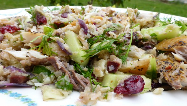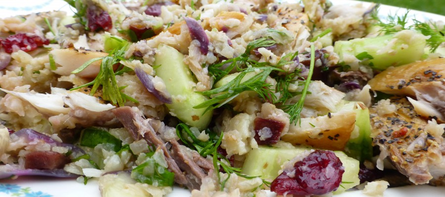 AIP/PALEO. En matig sallad med smak av dill, persilja och med söta dadlar och tranbär som är en god kontrast till den salta makrillen. Blomkål är perfekt att göra falsk couscous på.