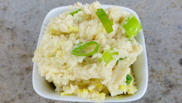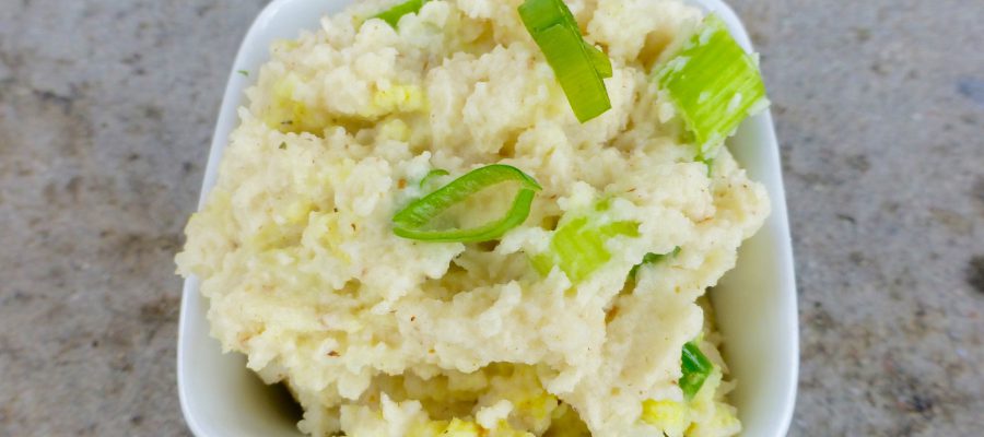 300 g Blomkål (ett halvt huvud) 2 msk Jordmandelmjöl (mandelmjöl vid paleo) 1 hackad vitlöksklyfta (en halv för mindre smak) 1/2 Citron, juicen 1 msk Olivolja Lite Havssalt 1 Salladslök eller lite gräslök till servering Gör så här: