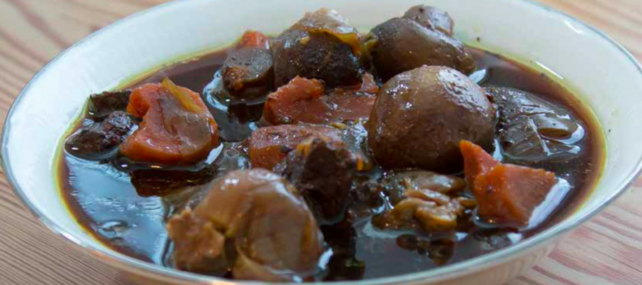 AIP. Detta är en klassisk franska köttgryta på lök, champinjoner, rött vin och köttbuljong. Köttet kokar långsamt och får smak av det röda vinet. Det går också bra att tillaga rätten utan vin. Det är vanligt att recept till denna typ av grytor innehåller mjöl som redning av såsen. När vi tar bort detta behöver vi därför något längre koktid för att reducera såsen. Tillsätt en matsked arrowrot om ni vill reda grytan så den blir klar lite fortare.