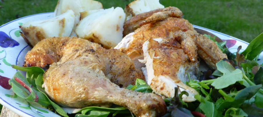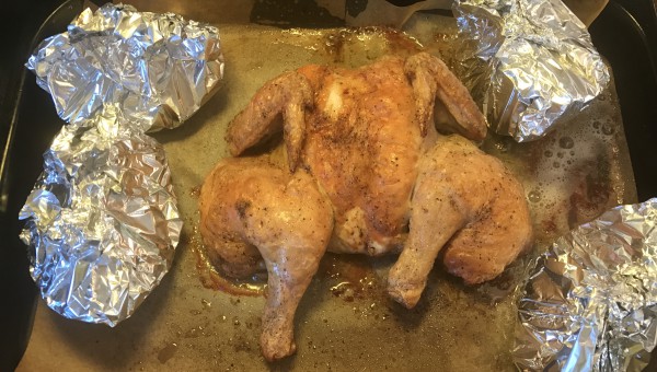 PALEO/AIP. När man tar bort ryggbenet på kycklingen och plattar ut den till en ”fjäril” så tillagas den jämnare – och snabbare. Kryddningen behöver inte vara mer än kokosolja med salt och peppar (uteslut ev peppar vid strikt AIP), men det går bra att gnida in den med färska örter och vitlök också. Servera med t ex rotselleri eller andra rotfrukter som tillagas tillsammans med kycklingen i ugnen.