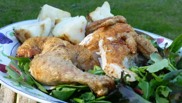 Servera med grönsallad och de ugnsbakade rotfrukterna. Häll skyn som blivit över efter kycklingen över grönsakerna vid servering.