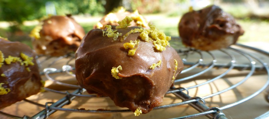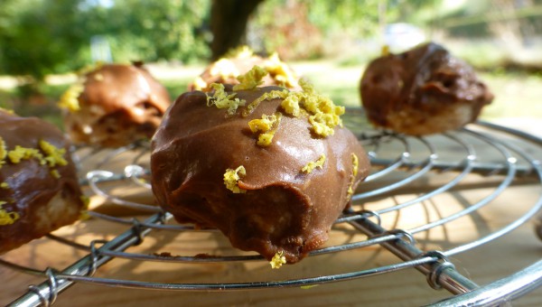 Forma små halvbollar med en tested. Doppa tryfflarna i chokladmoussen och lägg dem på ett bakplåtspapper eller på ett galler. Riv citronskal fint över direkt innan moussen hunnit stelna. Låt tryfflarna stå i kylen en stund före servering. De smakar bäst kalla.