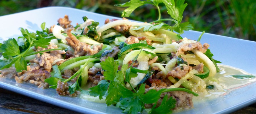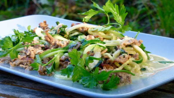 AIP/PALEO. Svarvad zucchini, lök, vitlök, persilja, kokosmjölk och nötfärs. Stek ihop och du har en enkel vardagsrätt som är både god, nyttig och mättande.