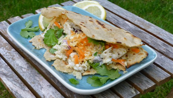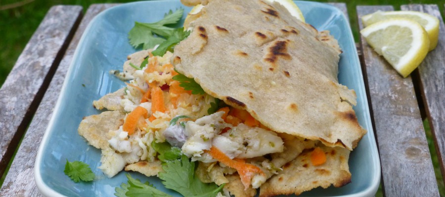 4 st Tortillas (recept under bröd och bakverk) 400 g Vit fisk, t ex torsk, spätta, kummel, gös Coleslaw Ingredienser: 4-5 dl Grovt riven eller strimlad vitkål 2 st Rivna morötter 2 st Äpplen, skalade och rivna 1 msk Olivolja 2 tsk Äppelcidervinäger Lite Salt Limesås Ingredienser: 1 st Lime, juicen 2 dl Kokosgrädde 1 dl Finhackad koriander eller persilja Lite Salt 1 extra Lime till servering Gör så här: