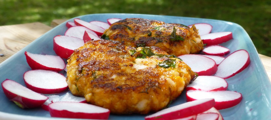 Forma små fina platta burgare med blöta händer. Stek ca 5 minuter per sida i kokosolja/avokadoolja eller olivolja av god kvalité.