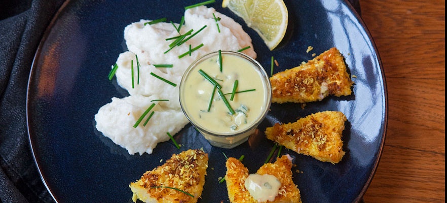 300 g färsk fisk till exempel lax 1 dl Riven kokos 1 nypa Vitkölspulver 1 tsk gurkmeja 1 tsk havssalt kokosolja till stekning Blomkålsmos Ingredienser: 1 Blomkålshuvud 2 msk Kokosmjölk 1 knippe dill eller 1 msk torkad salt efter smak Tartarsås Ingredienser: 1 dl Koksogrädde 1 citron, juicen 2 msk finhackad pressgurka/ättiksgurka 1 msk Gräslök, finhackad Gör så här: