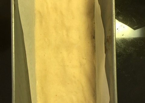 Lägg 75% av degen, smeten i botten av en sockerkaksform/brödform med bakplåtspapper i tryck ut i kanterna. Grädda i ca 20-25 minuter.