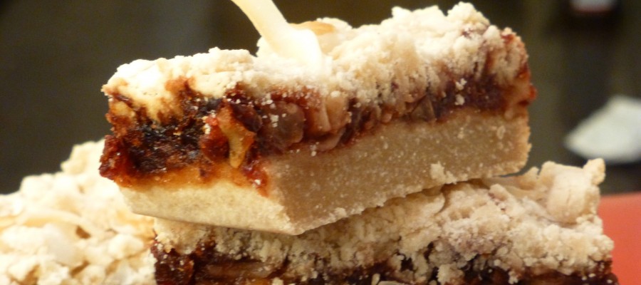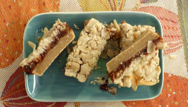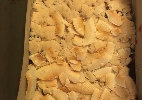Till smuldegen Ingredienser 2 dl Kokosgrädde/mjölk 4 msk Kokosolja, smält 1 msk Citronjuice 3 dl Cassavamjöl Otto's om annan sort 4 dl 1/2 dl Kokoschips, rostade eller vanliga 1 dl Kokosmjöl Lite salt och ev lite vaniljpulver Till fyllningen Ingredienser 2 dl torkad frukt, t ex tranbär 5 st Dadlar, urkärnade 4 msk Citronjuice 4 msk Kokoschips Gör så här: