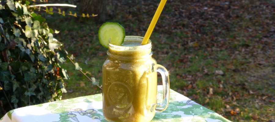 1 krm Gurkmeja 1 krm Kanel 1-2 dl Kallt vatten 10 cm Färsk gurka 2 st Stjälkar selleri 1x1 cm Färsk ingefära 1/2 msk Äppelcidervinäger 2 nävar Färsk babyspenat 1 dl Frysta bär (hallon, blåbär) Ev Lite honung om den är för syrlig (smaksak) Gör så här:
