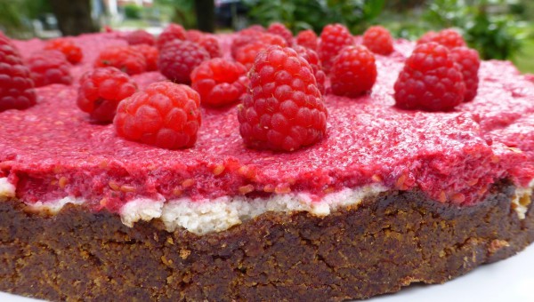 Gör hallontäcket. Mixa hallon, kokosolja (smält), gelatin och kokosmjölk. Vänta i 10 minuter innan du häller över hallonröran.