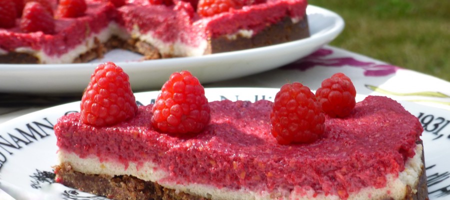Ställ kakan kallt i minst 2 timmar innan servering. Toppa med färska hallon.