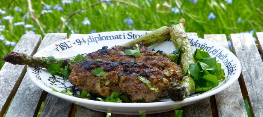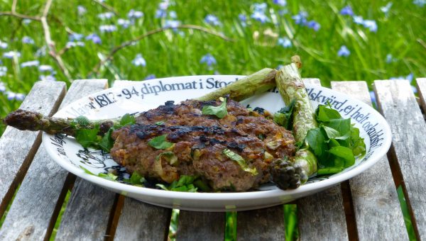 300 gram köttfärs av t ex högrev 1 vitlöksklyfta 1 hackad gul lök 2 salladslökar eller 10 cm purjolök 3 dl riven zucchini, ca 200 gram 1 tsk havssalt Gör så här: