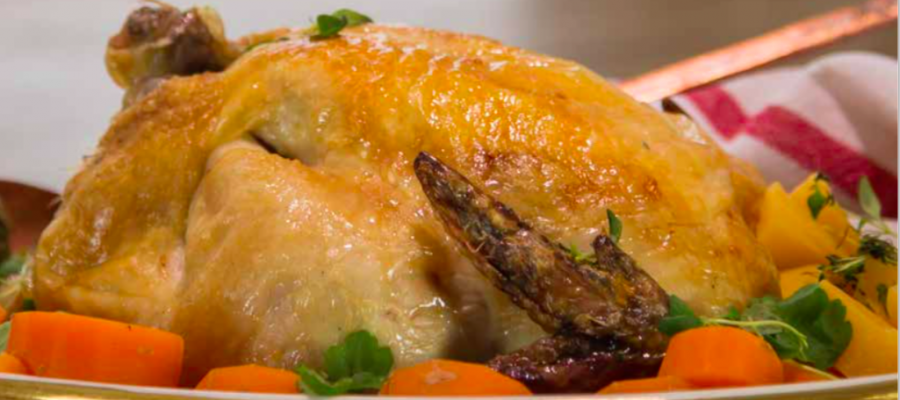 AIP. Passa på att stek en hel kyckling i ugnen när du väl ska laga till kyckling. Av skrov och ben kan du koka kycklingbuljong. Om du vill ha en riktigt mör kyckling ska du låta den gå på låg värme i 3–4 timmar, ca 125°. Om du vill ha den klar tidigare kan du köra den i en timme på 200°. Täck med aluminiumfolie sista 20 min så skinnet inte bränns. Mixa de ugnsstekta grönsakerna och sky tillsammans med 2-3 dl kokosgrädde för en god sås till kycklingen. Servera med sötpotatis, broccoli och eller blomkålsris. (Recept under vegetariskt).