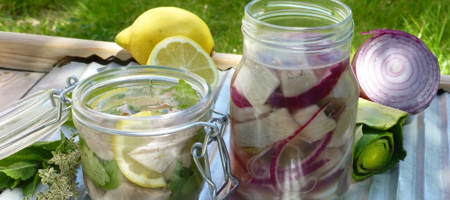 För ört- och citronsillen; lägg alla färska kryddor i en burk tillsammans med fint skivad citron. Häll över hälften av spadet och tillsätt sillbitar.
