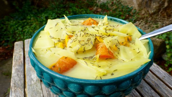 500 gram hackad vitkål 4 st Morötter 1 st Gul lök 2 st Lagerblad 1 tsk Torkad timjan eller 1 knippe Färsk koriander 1 st Citron eller lime, juicen 4 dl Kokosmjölk /1 burk 1 nypa Havssalt Gör så här: