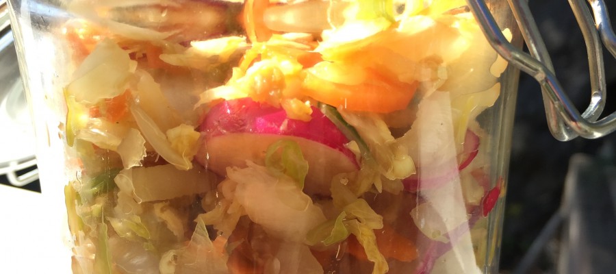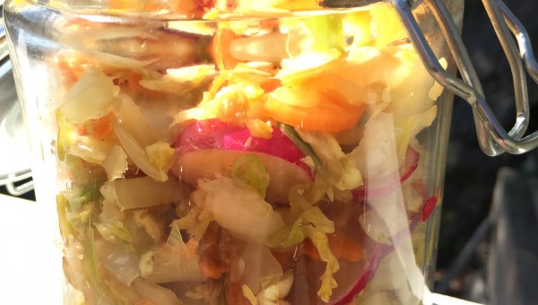 1 st Salladshuvud av kinakål/spetskål 2 msk Salt 2 dl Rädisor, skivade tunt 2,5 dl Morötter, finskivade/strimlade/rivna 4 msk Ingefära, färsk finhackad 3 st Vitlöksklyftor, finhackade 1/2 msk Honung eller kokossocker ca 1 l Kallt vatten Gör så här: