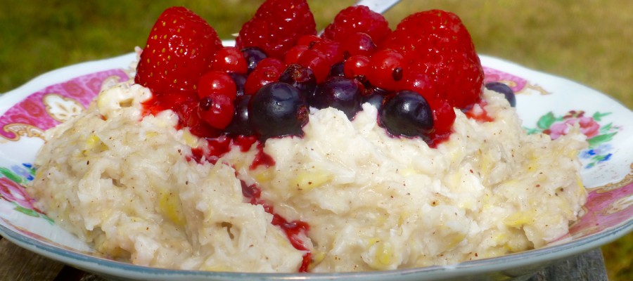 AIP/PALEO. Frukostgröt som har bra konsistens. Gröten är väldigt söt i sig, så det kan behövas lite sura/syrliga bär för att balansera smaken. Svartvinbär och hallon passar bra. Är med kall kokosmjölk. För vanlig paleo, krossa lite nötter och ät med t ex mandelmjölk.
