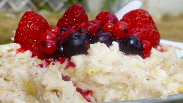 Häll i kokosflingor till en lagom konsistens. Låt svälla i 5 minuter. Häll färska eller tinade bär över och ät tillsammans med lite kokosmjölk eller ät som den är.