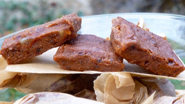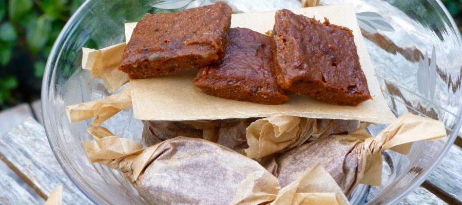 Mixa dadlar, kokosolja, apelsinskal, apelsinjuice, carob/kakao med en stavmixer till en jämn tjock smet.