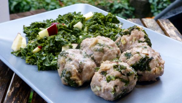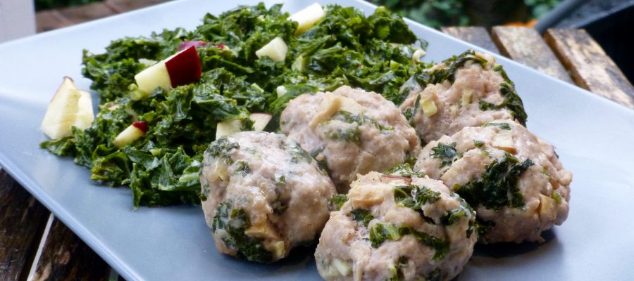 AIP/PALEO. Äpple och grönkål och passar ihop med fläskkött så därför är dessa köttbullar gjorda på fläskfärs. Servera med grönkålsröra & äppeltärningar eller till exempel kokta rotfrukter och äppelchutney.