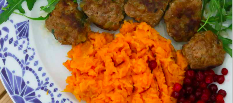 AIP. Köttbullarna smakar lite kryddnejlika och moset kan man variera med olika rotfrukter. Detta recept är på sötpotatis. Testa annars att göra mos på jordärtskocka, morötter, palsternacka eller kålrot.