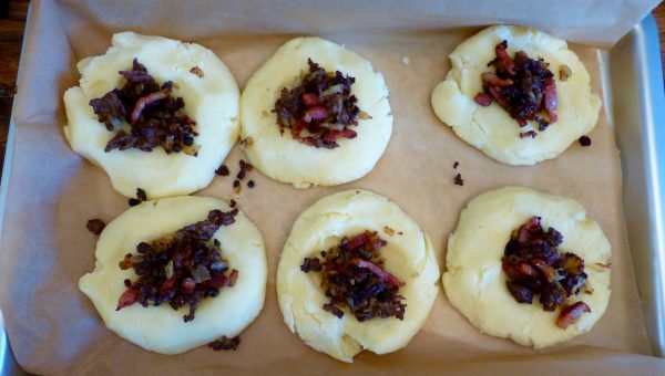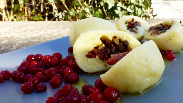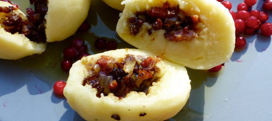 500 g Kokt mjölig vinterpotatis 1 dl Potatismjöl 1 ägg 1 extra äggula 1 tsk Havssalt Fyllning Ingredienser: 100 g Rökt sidfläsk eller eko bacon 100 g Nötfärs 1 tsk Grovt mald kryddpeppar 1 Gul lök 1 nypa Havssalt och svartpeppar 2 dl Lingon (rårörda) till servering 1 dl Ghee (klarnat smör) till servering Gör så här: