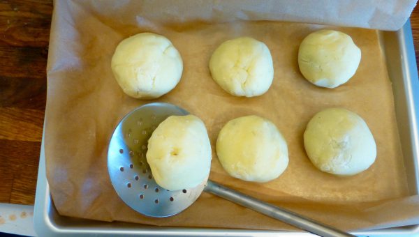 Vik ihop kroppkakorna och forma dem till runda bullar. Det går lättare om du tar lite potatismjöl på händerna.