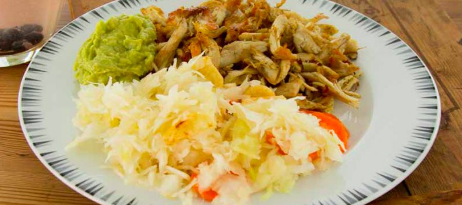 1 dl Surkål 150 g Färdiglagad kyckling 1/2 dl Guacamole Guacamole Ingredienser: 2 avokado 1 vitlöksklytfa 1 finackad liten rödlök (valfritt) 1 lime 1 msk olivolja 2 msk färsk finhackad korander, basilika eller persilja 1 nypa salt Gör så här: