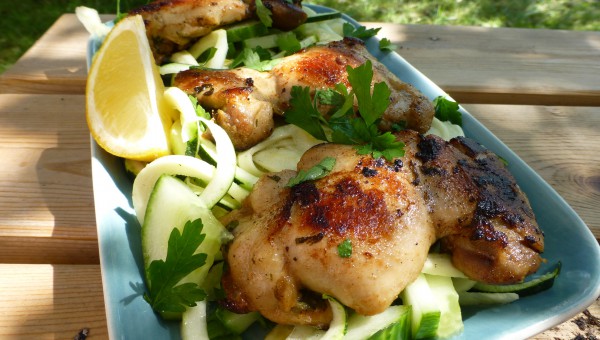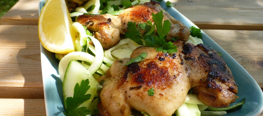 500 g Kycklingklubbor, eller lårkött utan ben Till marinaden Ingredienser: 2 msk Honung 3 st Vitlöksklyftor, pressade 1 msk Glutenfri soja (kan uteslutas) 1 krm Malen ingefära 1 dl Persilja, finhackad 3 msk Äppelcidervinäger 1 dl Kokosmjölk eller kokosgrädde 1 stor nypa salt Gör så här: