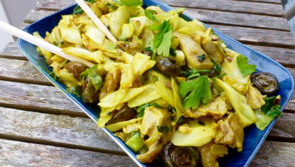 Strimla och stek vitkålen mjuk i kokosolja. Salta. Tillsätt hackad vitlök som får steka med mot slutet.