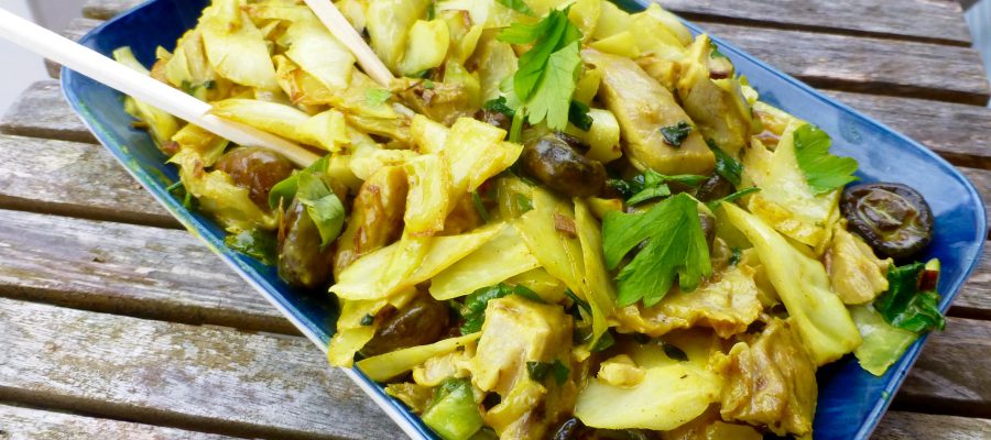 AIP/PALEO. Smakrik kycklingwok med gurkmeja, kokosmjölk, lime och persilja. Basen i woken består av strimlad vitkål som får fräsa ihop med vitlök och svamp.