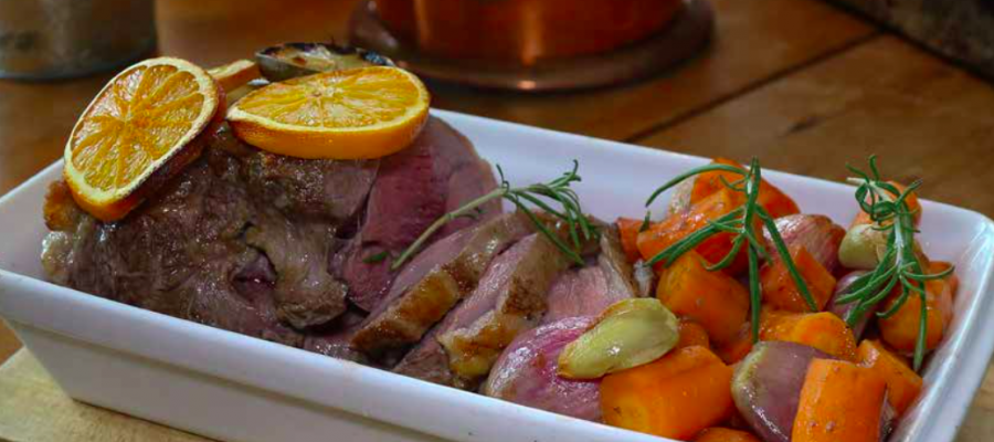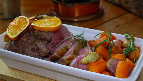 Krydda lammsteken med rosmarinen, salt och peppar och lägg den i en form eller en lergryta. Lägg citrusskivorna på steken och slantade morötter och skivad lök samt krossade vitlöksklyftor runtom.