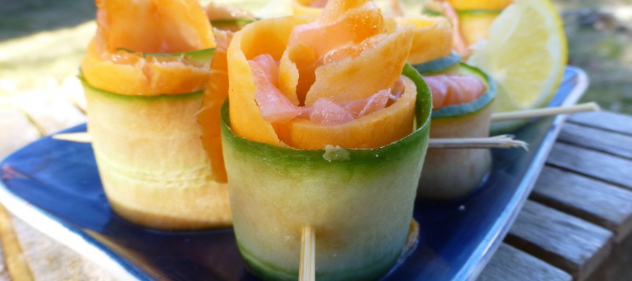 Gör långa skivor på längden av gurkan med en osthyvel. (Undvik mittendelen som bara är full med vatten och kärnor) Lägg en gurkskeiva underst, sedan sötpotatis och sist lax. Vira ihop och fäst med stora tandpetare eller avbrutna trägrillspett. Pressa riktigt med citron över varje rulle.