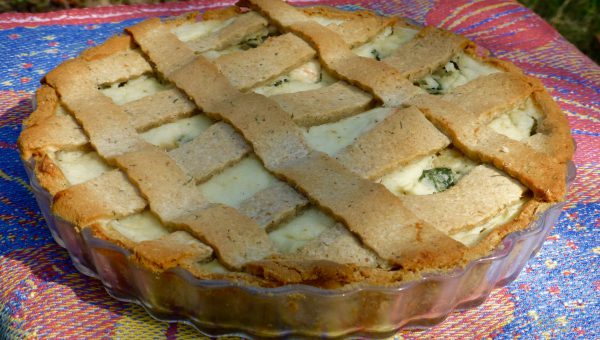 Pajen: Ta ut degen ur kylen och knåda den lite smidig innan du kavlar ut den mellan två bakplåtspapper. Dra bort ena pappret och vänd ner den kavlade degen i en pajform. Använd spillet till att göra rutmönster ovanpå pajen.