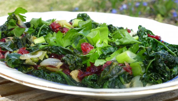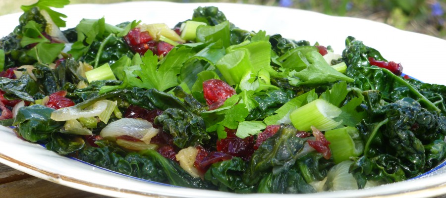 200 g Spenat i påse (det krymper väldigt mycket) 200 g Grönkål/svartkål, efter säsong 2 dl Torkade tranbär 3 st Salladslökar 1 msk Äppelcidervinäger 1 nypa Havssalt Lite Olivolja att steka i Lite Persilja Gör så här: