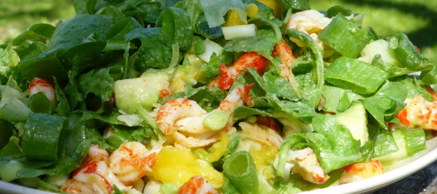 1 burk Kräftstjärtar 2 st Salladslökar med blast 1 st Mogen mango 1-2 st Avokado 100 g Ruccola (en påse) Dressing Ingredienser: 1/2 dl Olivolja, rumstempererad 3 msk Smält kokosolja 1 st Lime, juicen 1 nypa Salt Gör så här: