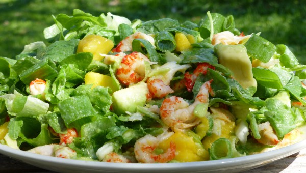 Sätt ihop salladen. Blanda ruccola, lök, mango, avokado och kräftstjärtar med dressingen.