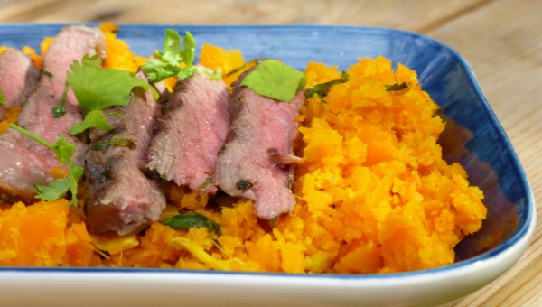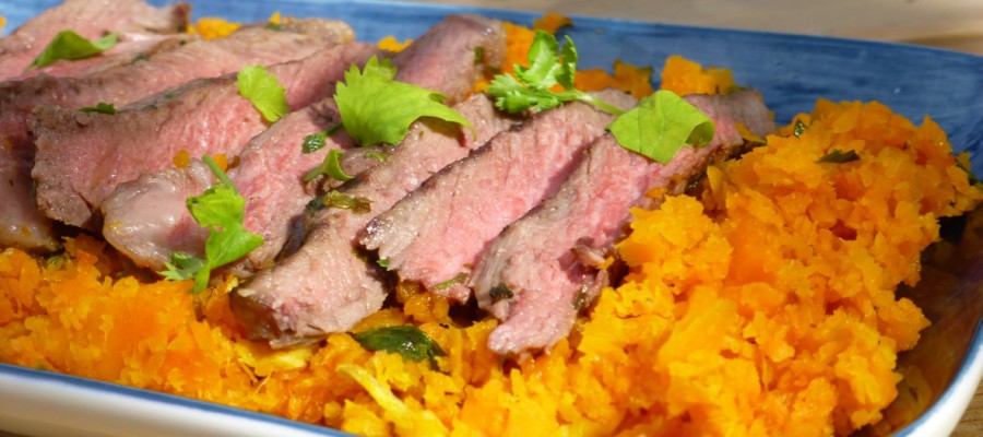 Marinad Ingredienser 4 msk Finhackad persilja 4 msk Finhackad koriander 4 msk Olivolja Lite Havssalt 500 g Nötkött, t ex flankstek Morotsris Ingredienser 6 st Stora morötter 1 kub Färsk ingefära 2x2 cm 1 tsk Äppelcidervinäger Fett till stekning Kokosolja, olivolja Gör så här: