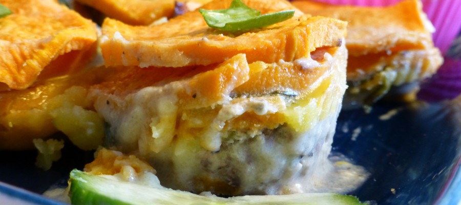 Skala och skiva sötpotatisen - det är bra om de är ganska små så att skivorna får plats i muffinsformar, annars dela skivorna så att de passar.