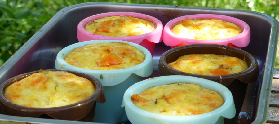 Vispa ihop ägg och kokosmjölk, salta. Tillsätt finhackad persilja. Fyll muffinsformar med potatis och morötter och häll över äggblandningen.