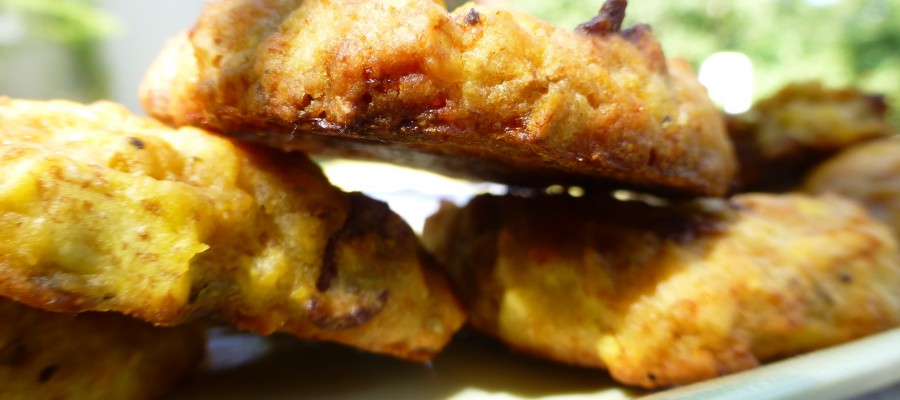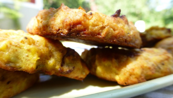 1 st Kokbanan, grön mot gulnande 3 bitar Bacon, eko 1 dl Cassavamjöl 2 msk Kokosmjöl 2 st Vitlöksklyftor, finhackade 1 tsk Timjan, finhackad 1 tsk Oregano, torkad 2 msk Kokosolja, smält 1/2 msk Gelatinpulver 2 msk Hett vatten 1/2 tsk Bakpulver 1 tsk Äppelcidervinäger Gör så här: